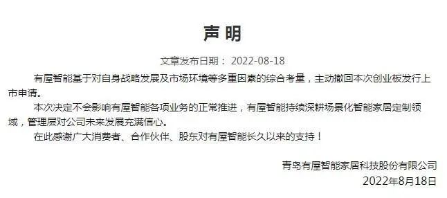 深交所最新消息顯示,青島有屋智能家居科技股份有限公司8月18日已主動申請撤回本次創(chuàng)業(yè)板發(fā)行上市申請文件。相關(guān)公告掛網(wǎng)后,有屋智能也于第一時間發(fā)布聲明表示,“有屋智能基于對自身戰(zhàn)略發(fā)展及市場環(huán)境等多重因素的綜合考量,主動撤回本次創(chuàng)業(yè)板發(fā)行上市申請。本次決定不會影響有屋智能各項業(yè)務(wù)的正常推進(jìn),有屋智能持續(xù)深耕場景化智能家居定制領(lǐng)域,管理層對公司未來發(fā)展充滿信心。”