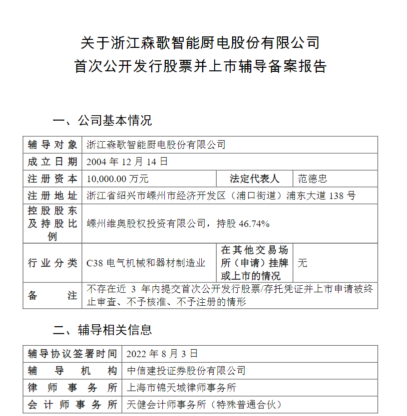 8月18日,證監(jiān)會網(wǎng)站披露,浙江森歌智能廚電股份有限公司進(jìn)入IPO輔導(dǎo)備案期,已于2022年8月3日與輔導(dǎo)機(jī)構(gòu)中信建投證券股份有限公司簽署輔導(dǎo)協(xié)議。2021年,森歌智能廚電獲得金鼎資本3000萬人民幣戰(zhàn)略融資。今年6月,完成股改的浙江森歌電器有限公司更名為“浙江森歌智能廚電股份有限公司”。